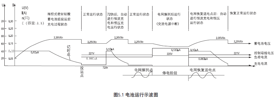2) 通电前必须检查确认所有工作是否正确无误,接通直流电源系统电源时,充电装置通过自动或手动控制即可投入运行,运行有三种状态(即主充、均充、浮充),充电曲线见图5.1: